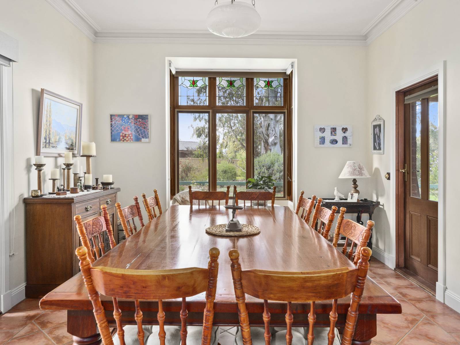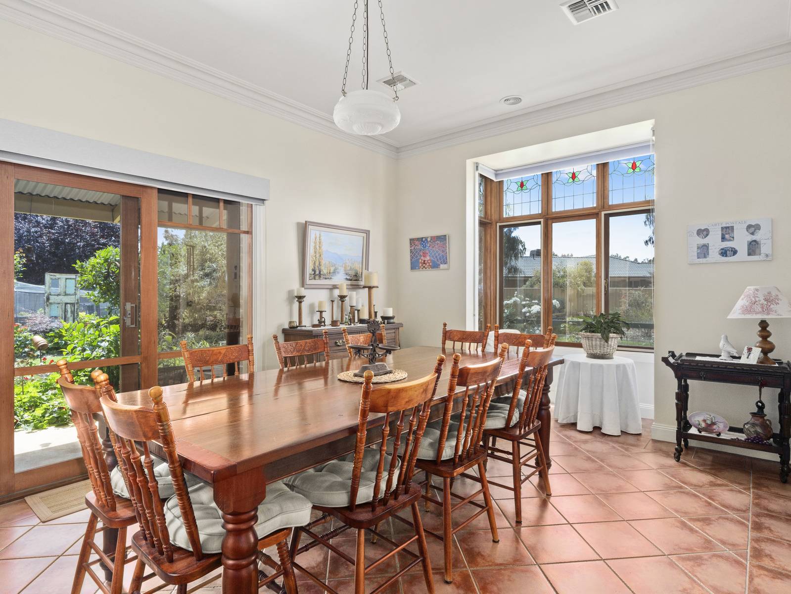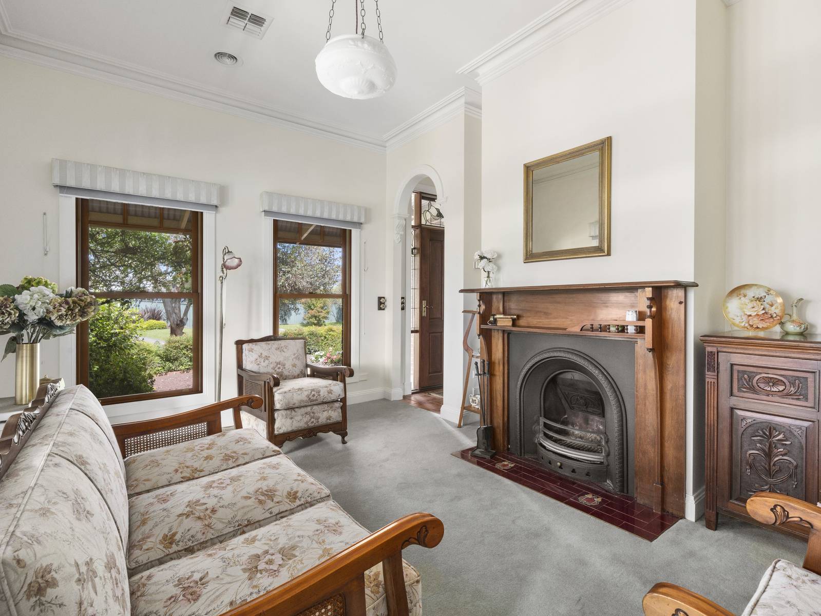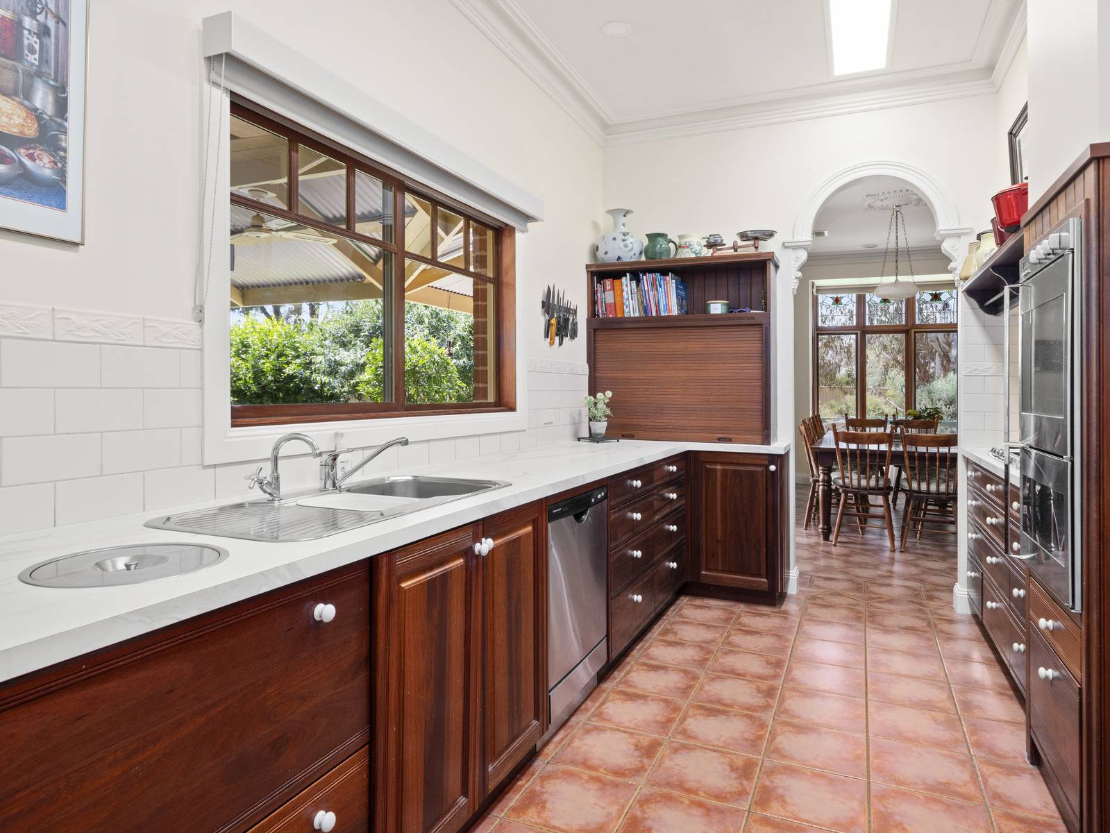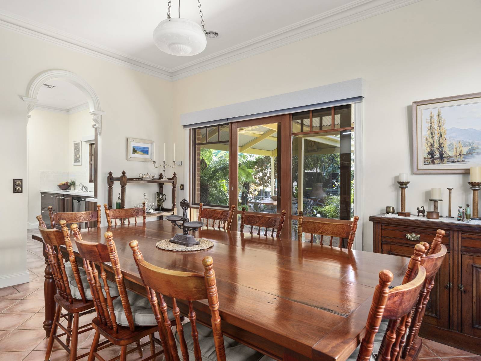 A flexible floorplan offers formal and informal living areas, the formal sitting room is an elegant room with a cosy open fireplace. The dining room adjoining the kitchen, is spacious enough for a large table, with direct access to the under cover alfresco dining space,  perfect for entertaining.   Features are extensive such as timber windows, French doors, lead light feature windows, insulated cellular blinds, quality terracotta floor tiles, 3+ m high ceilings, period cornicing, ceiling roses and arches. Seasonal comforts include ducted gas heating and ducted R/Cycle to all rooms. There is also a ducted vac, 2.5 KW solar power and solar electric hot water.