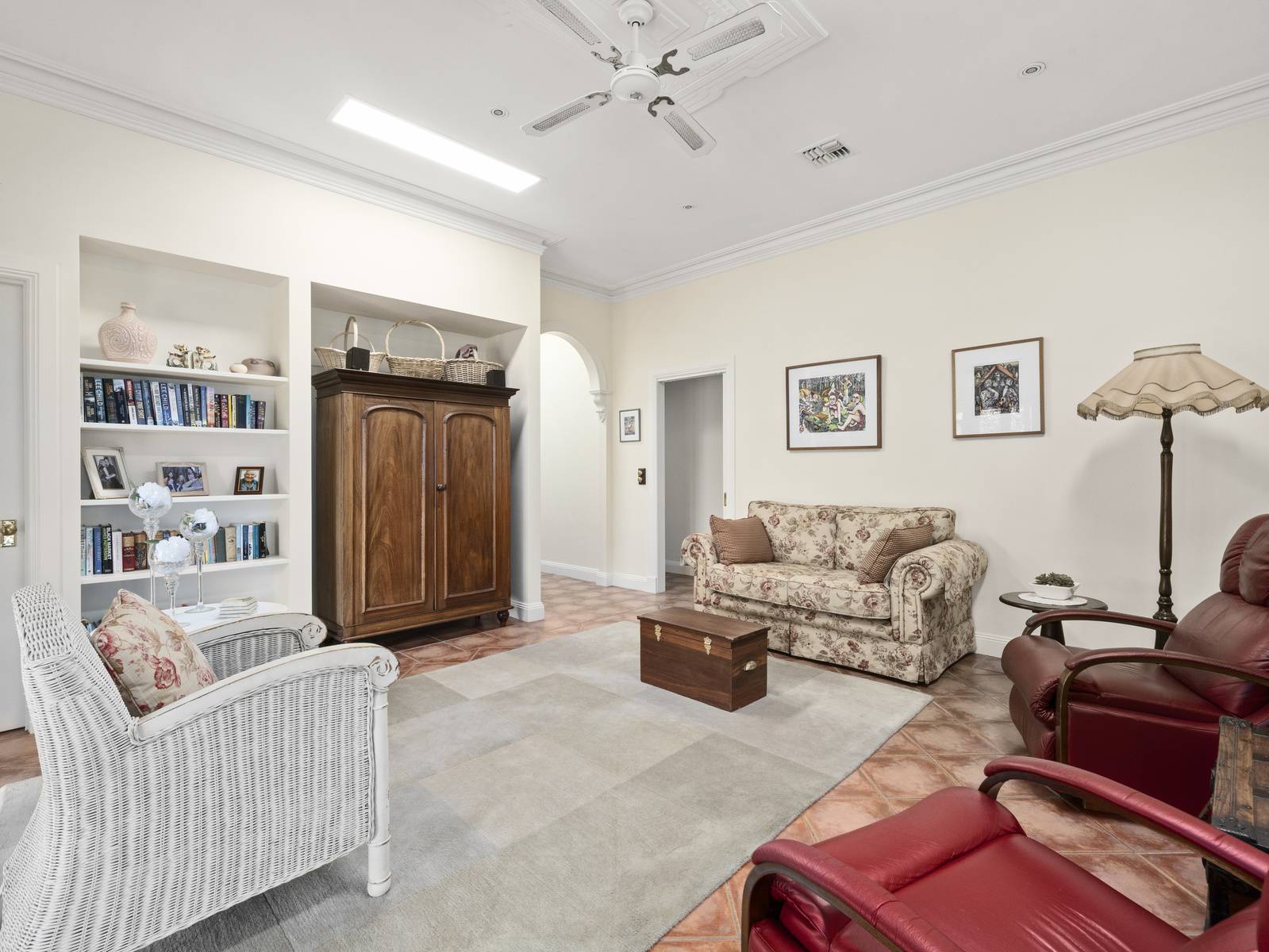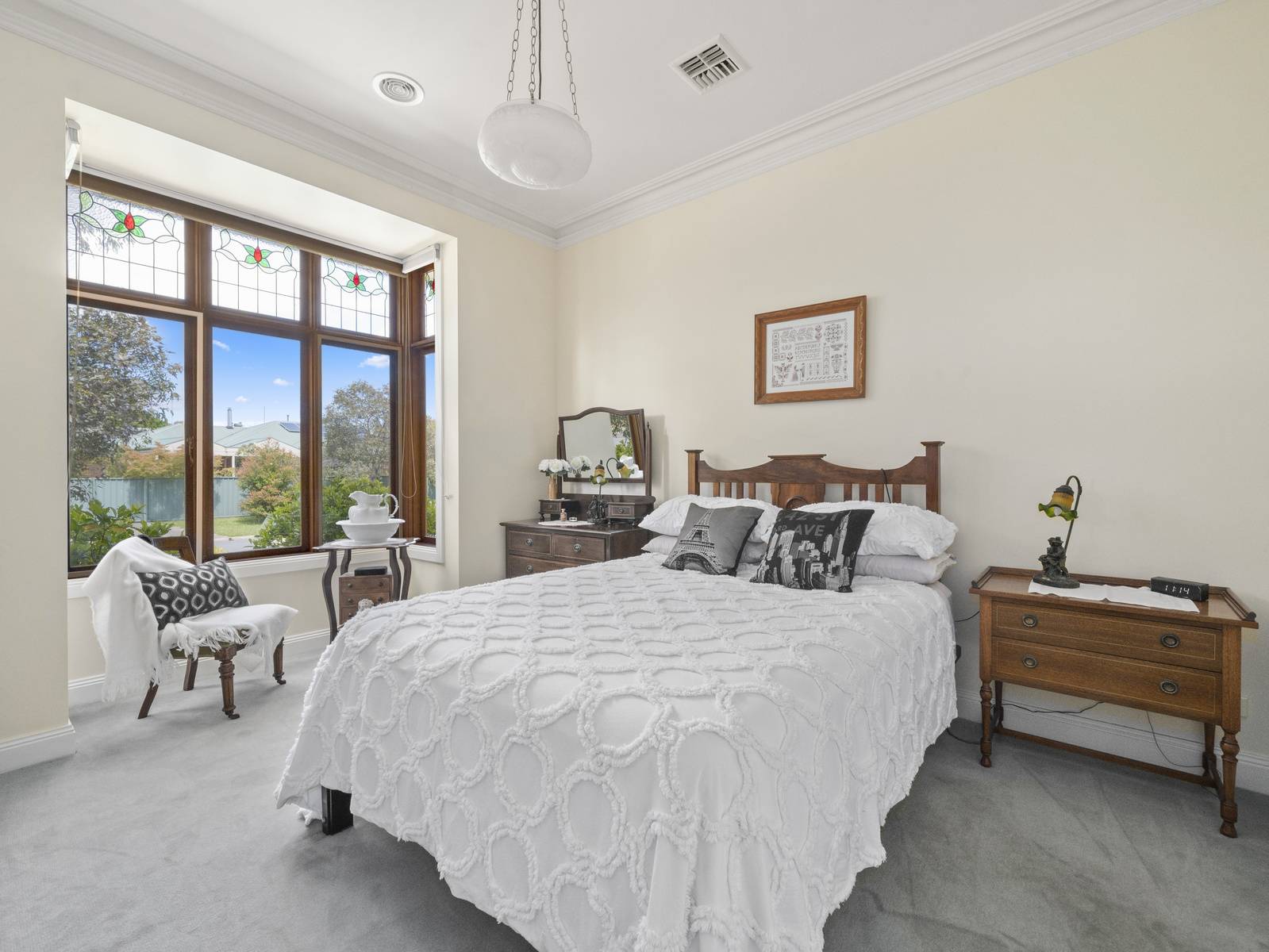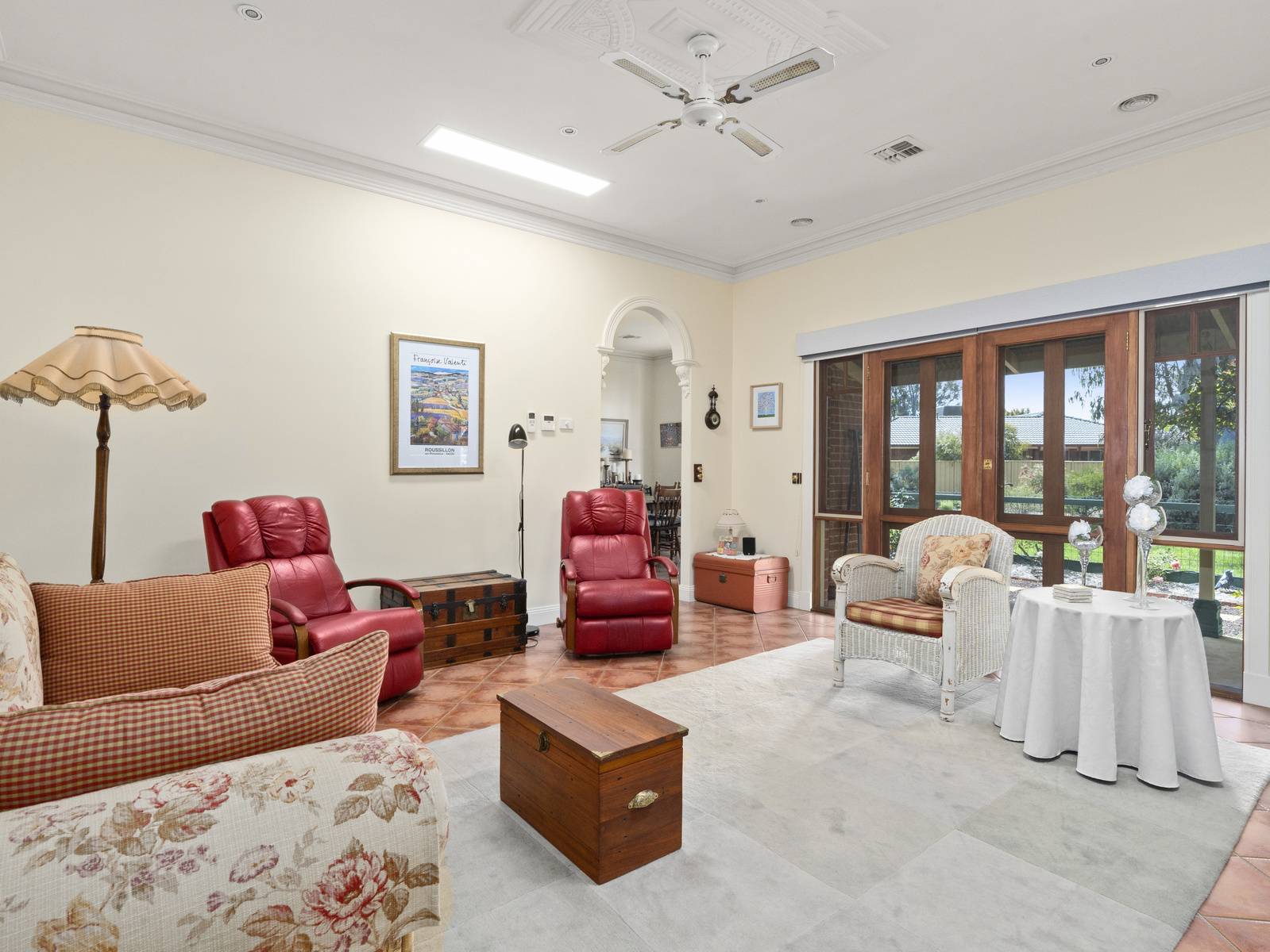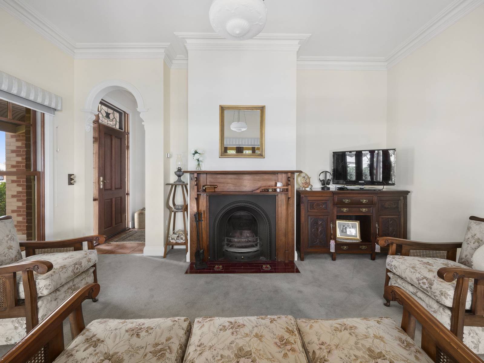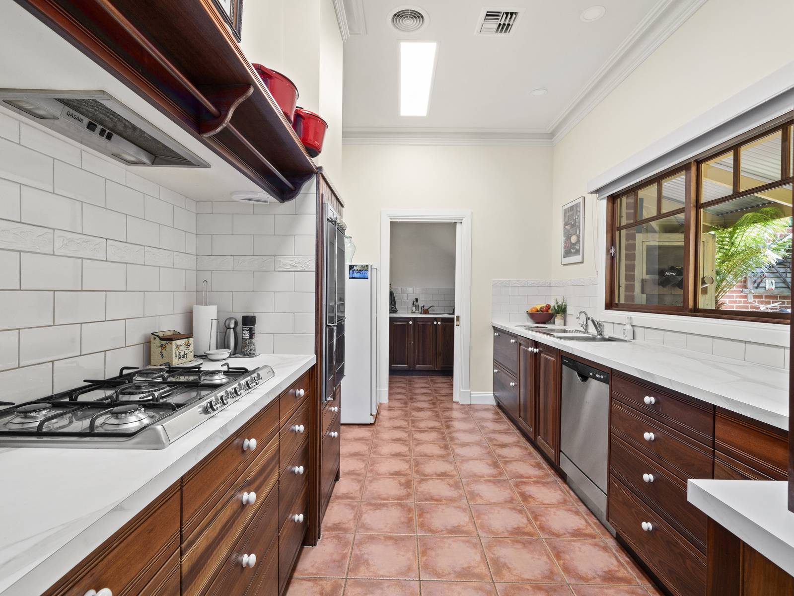 A flexible floorplan offers formal and informal living areas, the formal sitting room is an elegant room with a cosy open fireplace. The dining room adjoining the kitchen, is spacious enough for a large table, with direct access to the under cover alfresco dining space,  perfect for entertaining.   Features are extensive such as timber windows, French doors, lead light feature windows, insulated cellular blinds, quality terracotta floor tiles, 3+ m high ceilings, period cornicing, ceiling roses and arches. Seasonal comforts include ducted gas heating and ducted R/Cycle to all rooms. There is also a ducted vac, 2.5 KW solar power and solar electric hot water.