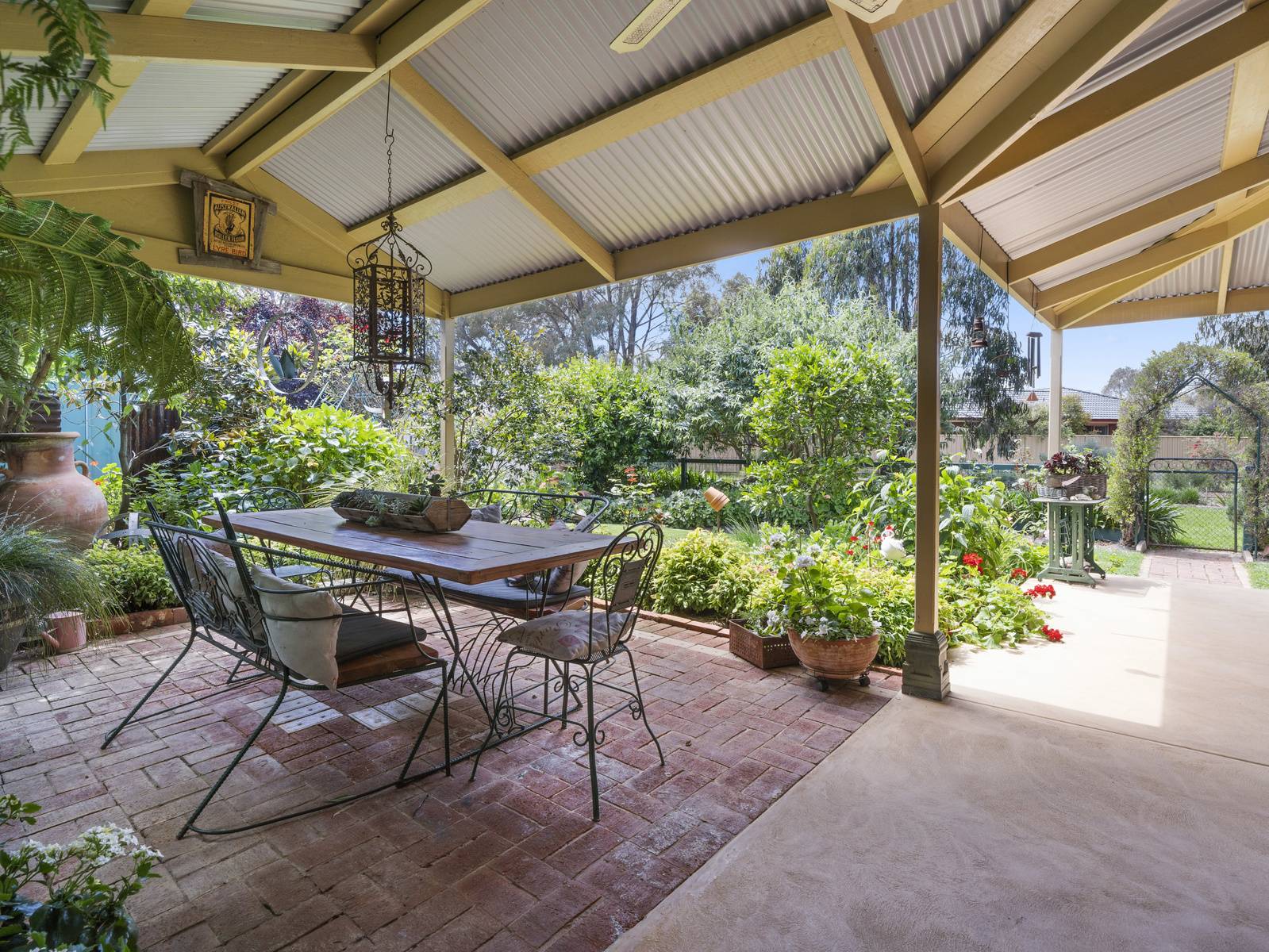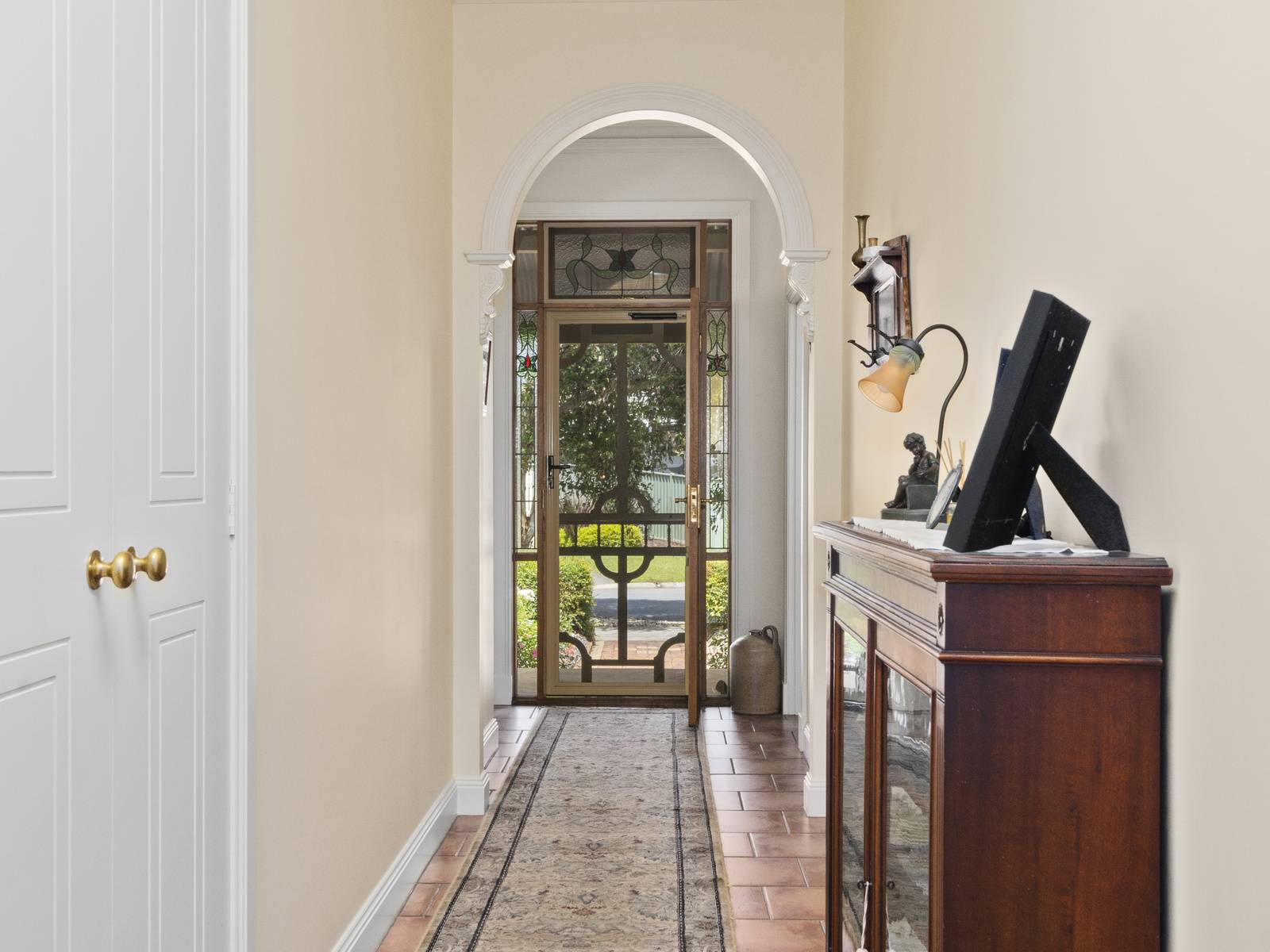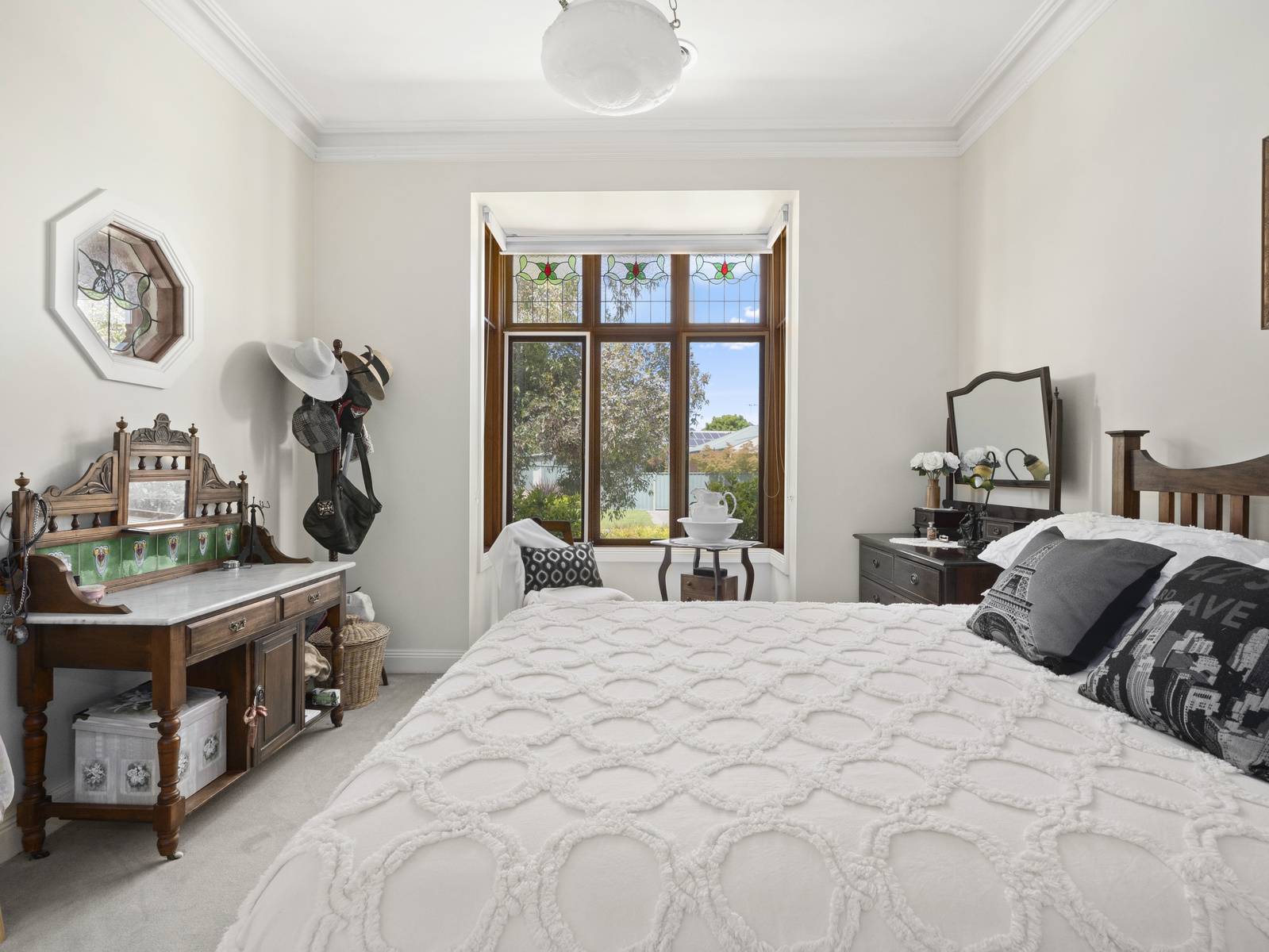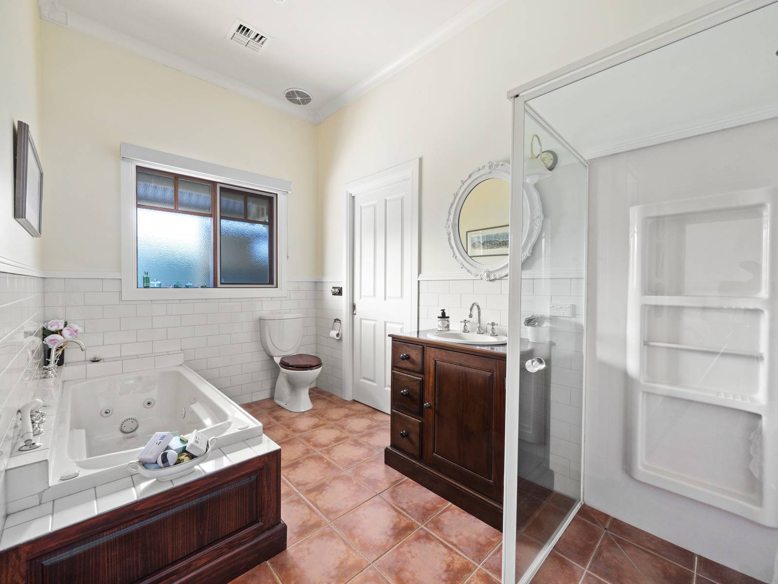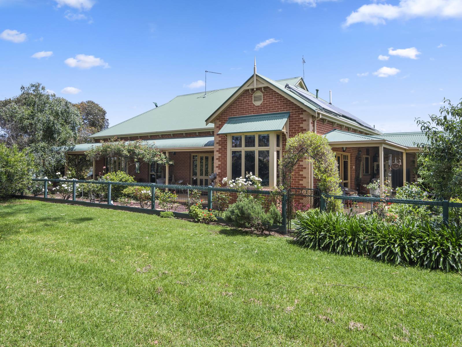 A flexible floorplan offers formal and informal living areas, the formal sitting room is an elegant room with a cosy open fireplace. The dining room adjoining the kitchen, is spacious enough for a large table, with direct access to the under cover alfresco dining space,  perfect for entertaining.   Features are extensive such as timber windows, French doors, lead light feature windows, insulated cellular blinds, quality terracotta floor tiles, 3+ m high ceilings, period cornicing, ceiling roses and arches. Seasonal comforts include ducted gas heating and ducted R/Cycle to all rooms. There is also a ducted vac, 2.5 KW solar power and solar electric hot water.