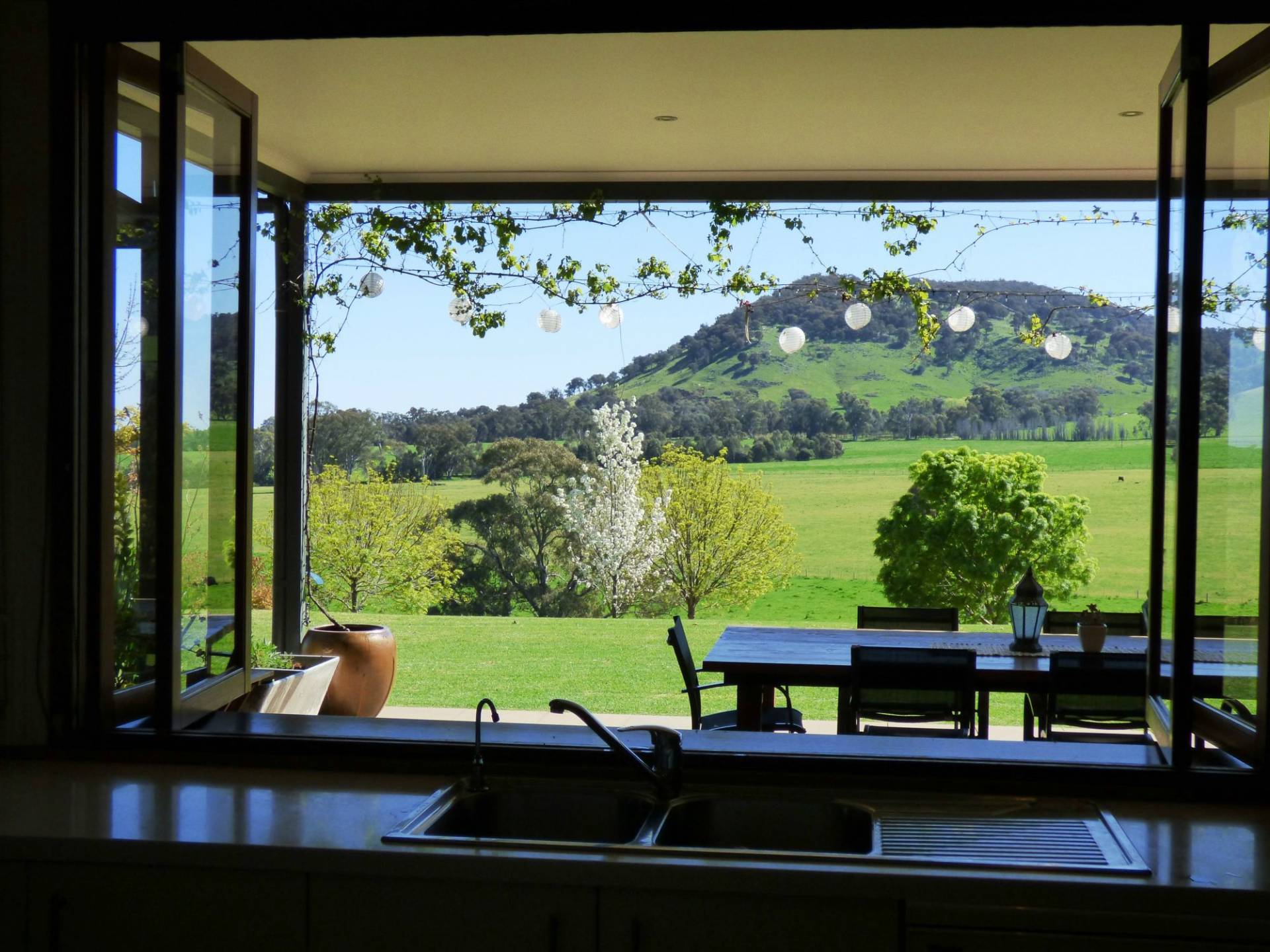- The home radiates space, featuring open plan lounge, kitchen and dining room with full length cedar doors and windows that bring the outdoors in.